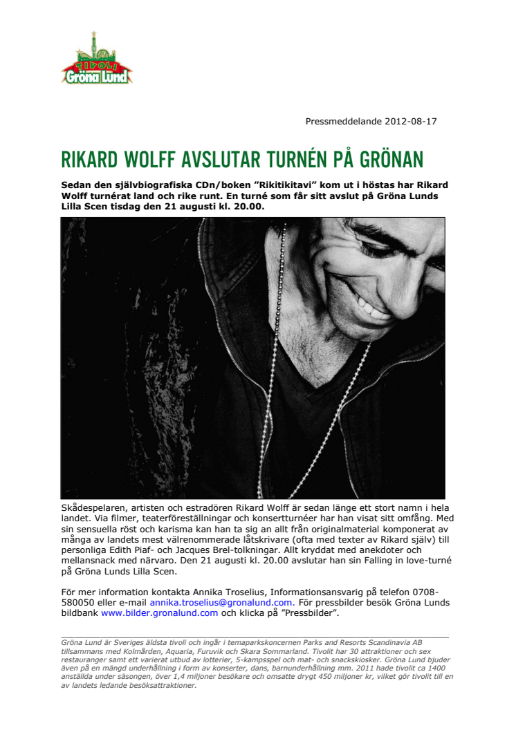 Sedan den självbiografiska CDn/boken ”Rikitikitavi” kom ut i höstas har Rikard Wolff turnérat land och rike runt. En turné som får sitt avslut på Gröna Lunds Lilla Scen tisdag den 21 augusti kl. 20.00.