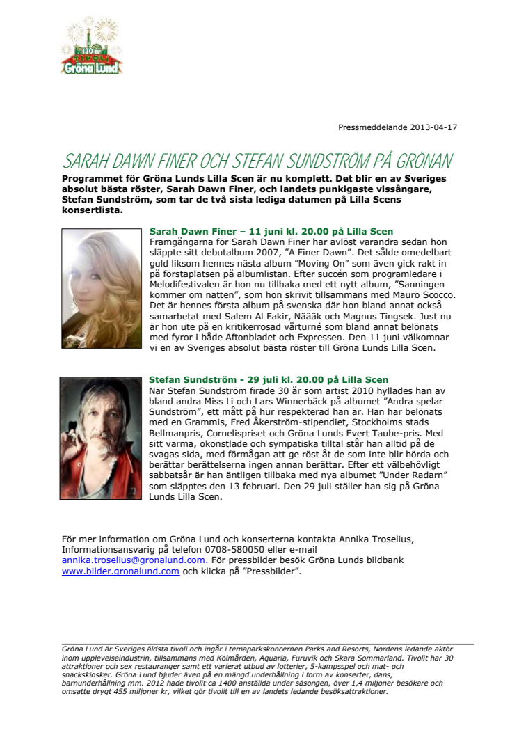 Programmet för Gröna Lunds Lilla Scen är nu komplett. Det blir en av Sveriges absolut bästa röster, Sarah Dawn Finer, och landets punkigaste vissångare, Stefan Sundström, som tar de två sista lediga datumen på Lilla Scens konsertlista.