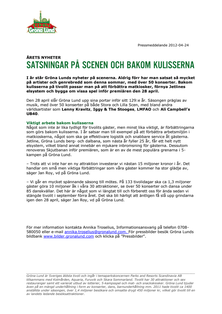 I år står Gröna Lunds nyheter på scenerna. Aldrig förr har man satsat så mycket på artister och genrebredd som denna sommar, med över 50 konserter. Bakom kulisserna på tivolit passar man på att förbättra matkiosker, förnya Jetlines elsystem och bygga om vissa spel inför premiären den 28 april.