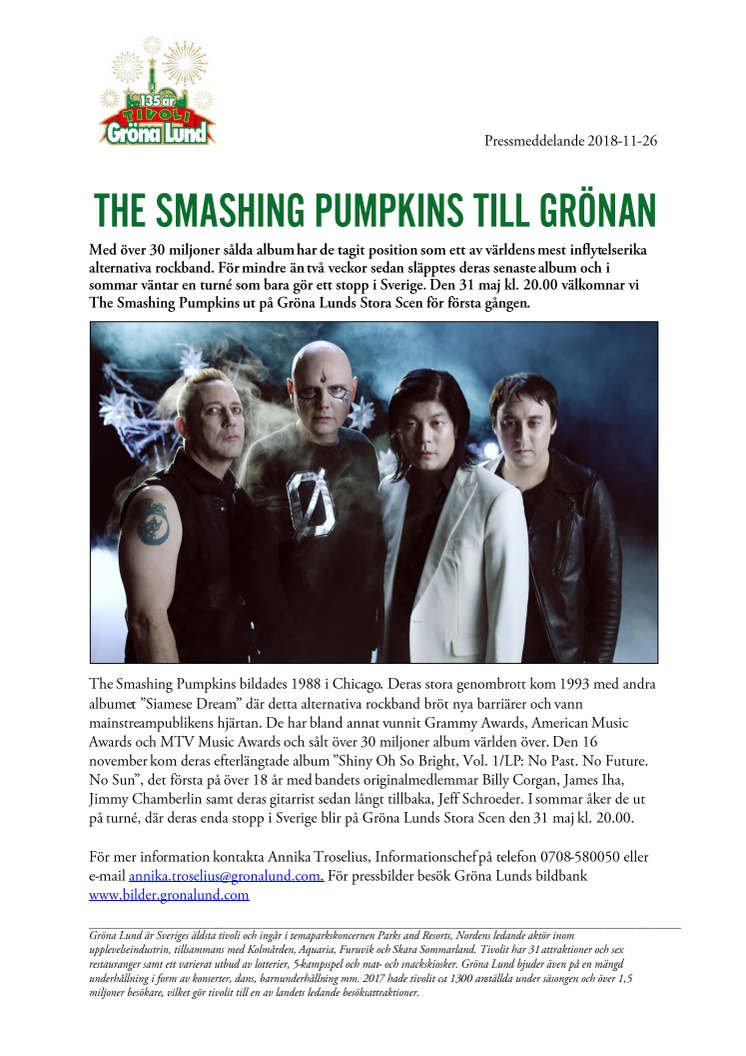 Med över 30 miljoner sålda album har de tagit position som ett av världens mest inflytelserika alternativa rockband. För mindre än två veckor sedan släpptes deras senaste album och i sommar väntar en turné som bara gör ett stopp i Sverige. Den 31 maj kl. 20.00 välkomnar vi The Smashing Pumpkins ut på Gröna Lunds Stora Scen för första gången.