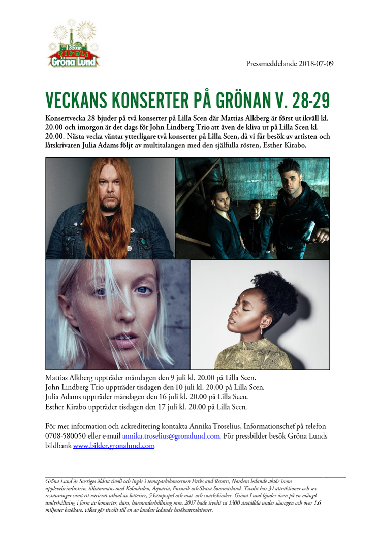 Konsertvecka 28 bjuder på två konserter på Lilla Scen där Mattias Alkberg är först ut ikväll kl. 20.00 och imorgon är det dags för John Lindberg Trio att även de kliva ut på Lilla Scen kl. 20.00. Nästa vecka väntar ytterligare två konserter på Lilla Scen, då vi får besök av artisten och låtskrivaren Julia Adams följt av multitalangen med den själfulla rösten, Esther Kirabo.