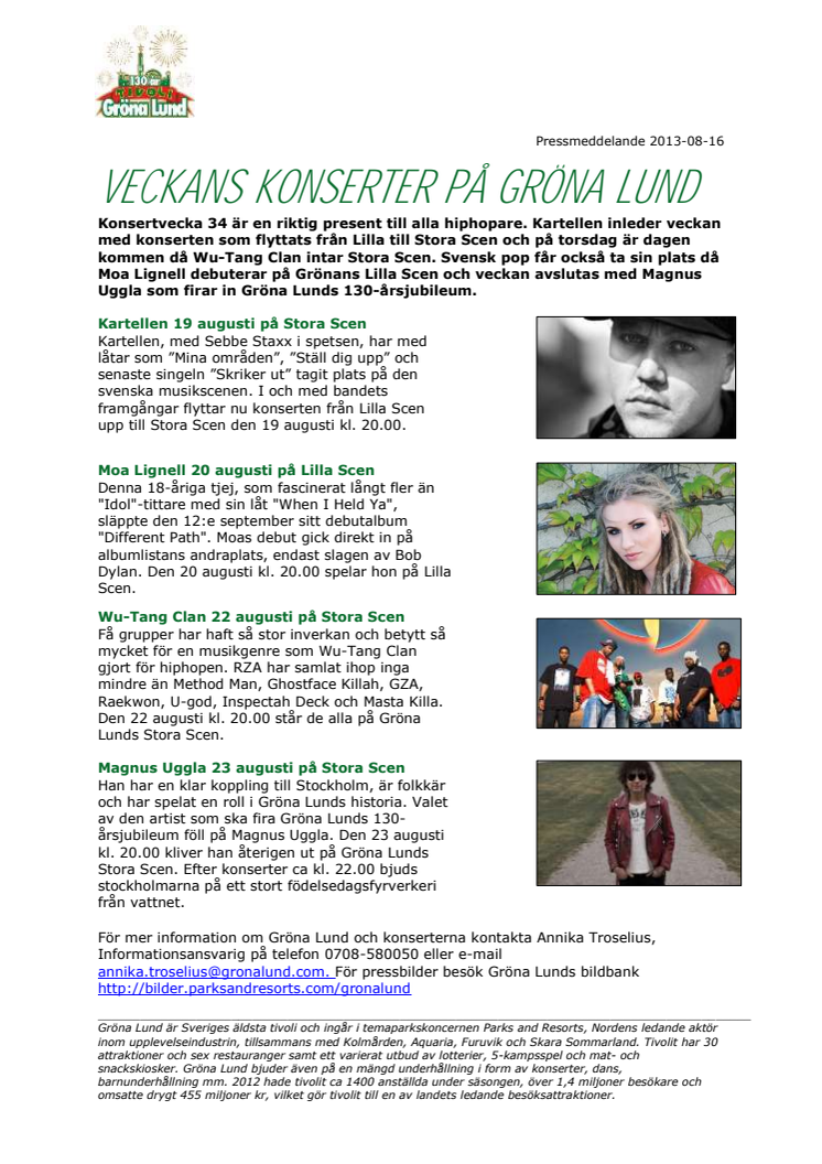 Konsertvecka 34 är en riktig present till alla hiphopare. Kartellen inleder veckan med konserten som flyttats från Lilla till Stora Scen och på torsdag är dagen kommen då Wu-Tang Clan intar Stora Scen. Svensk pop får också ta sin plats då Moa Lignell debuterar på Grönans Lilla Scen och veckan avslutas med Magnus Uggla som firar in Gröna Lunds 130-årsjubileum.