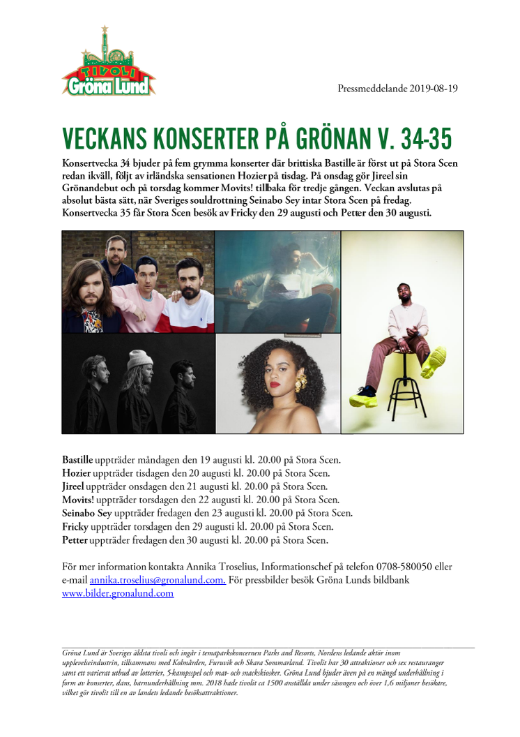 Konsertvecka 34 bjuder på fem grymma konserter där brittiska Bastille är först ut på Stora Scen redan ikväll, följt av irländska sensationen Hozier på tisdag. På onsdag gör Jireel sin Grönandebut och på torsdag kommer Movits! tillbaka för tredje gången. Veckan avslutas på absolut bästa sätt, när Sveriges souldrottning Seinabo Sey intar Stora Scen på fredag.