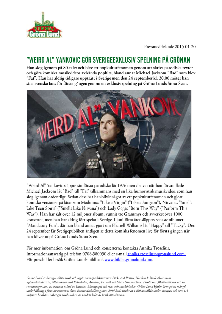 Han slog igenom på 80-talet och blev ett popkulturfenomen genom att skriva parodiska texter och göra komiska musikvideos av kända pophits, bland annat Michael Jacksons ”Bad” som blev ”Fat”. Han har aldrig tidigare uppträtt i Sverige men den 24 september kl. 20.00 möter han sina svenska fans för första gången genom en exklusiv spelning på Gröna Lunds Stora Scen.