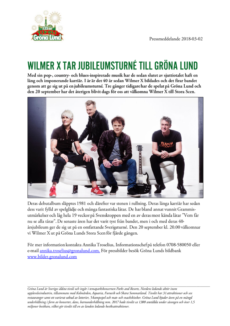 Med sin pop-, country- och blues-inspirerade musik har de sedan slutet av sjuttiotalet haft en lång och imponerande karriär. I år är det 40 år sedan Wilmer X bildades och det firar bandet genom att ge sig ut på en jubileumsturné. Tre gånger tidigare har de spelat på Gröna Lund och den 20 september har det återigen blivit dags för oss att välkomna Wilmer X till Stora Scen.