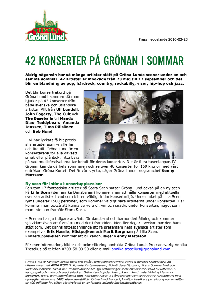 För mer information, bilder och ackreditering kontakta Gröna Lunds Pressansvarig Annika Troselius på telefon 0708-58 00 50 eller e-mail annika.troselius@gronalund.com.
