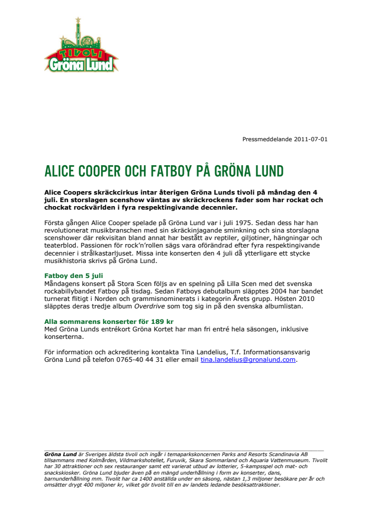 För information och ackreditering kontakta Tina Landelius, T.f. Informationsansvarig Gröna Lund på telefon 0765-40 44 31 eller email tina.landelius@gronalund.com.