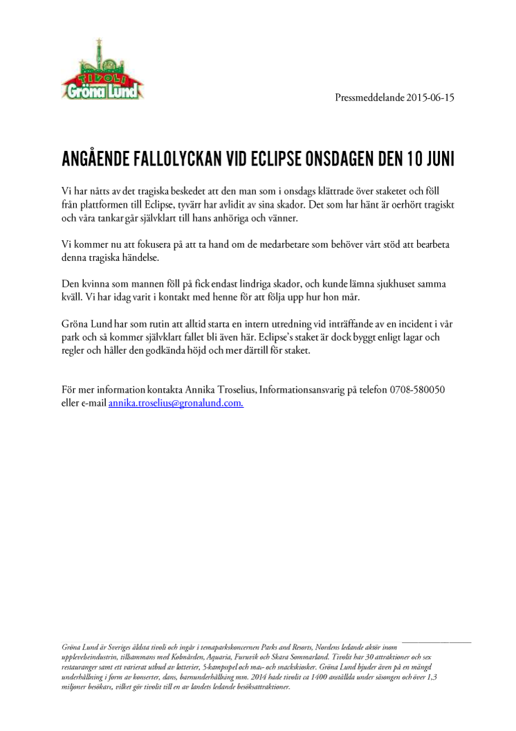 För mer information kontakta Annika Troselius, Informationsansvarig på telefon 0708-580050 eller e-mail annika.troselius@gronalund.com.För pressbilder besök Gröna Lunds bildbank www.bilder.gronalund.com.