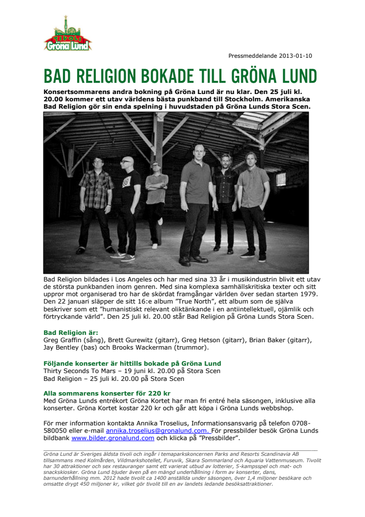 För mer information kontakta Annika Troselius, Informationsansvarig på telefon 0708-580050 eller e-mail annika.troselius@gronalund.com. För pressbilder besök Gröna Lunds bildbank www.bilder.gronalund.com och klicka på ”Pressbilder”.