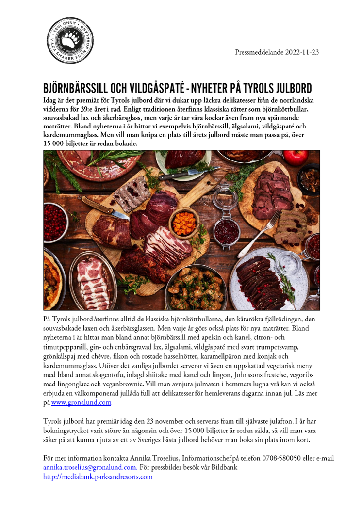 På Tyrols julbord återfinns alltid de klassiska björnköttbullarna, den kåtarökta fjällrödingen, den souvasbakade laxen och åkerbärsglassen. Men varje år görs också plats för nya maträtter. Bland nyheterna i år hittar man bland annat björnbärssill med apelsin och kanel, citron- och timutpepparsill, gin- och enbärsgravad lax, älgsalami, vildgåspaté med svart trumpetsvamp, grönkålspaj med chèvre, fikon och rostade hasselnötter, karamellpäron med konjak och kardemummaglass. Utöver det vanliga julbordet serverar vi även en uppskattad vegetarisk meny med bland annat skagentofu, inlagd shiitake med kanel och lingon, Johnssons frestelse, vegoribs med lingonglaze och veganbrownie.Vill man avnjuta julmaten i hemmets lugna vrå kan vi också erbjuda en välkomponerad jullåda full att delikatesser för hemleverans dagarna innan jul. Läs mer på www.gronalund.com