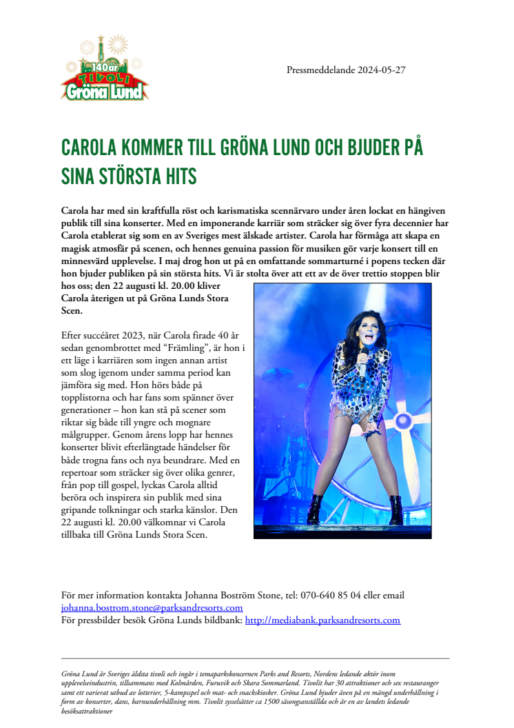 Efter succéåret 2023, när Carola firade 40 år sedan genombrottet med “Främling”, är hon i ett läge i karriären som ingen annan artist som slog igenom under samma period kan jämföra sig med. Hon hörs både på topplistorna och har fans som spänner över generationer – hon kan stå på scener som riktar sig både till yngre och mognare målgrupper. Genom årens lopp har hennes konserter blivit efterlängtade händelser för både trogna fans och nya beundrare. Med en repertoar som sträcker sig över olika genrer, från pop till gospel, lyckas Carola alltid beröra och inspirera sin publik med sina gripande tolkningar och starka känslor. Den 22 augusti kl. 20.00 välkomnar vi Carola tillbaka till Gröna Lunds Stora Scen.