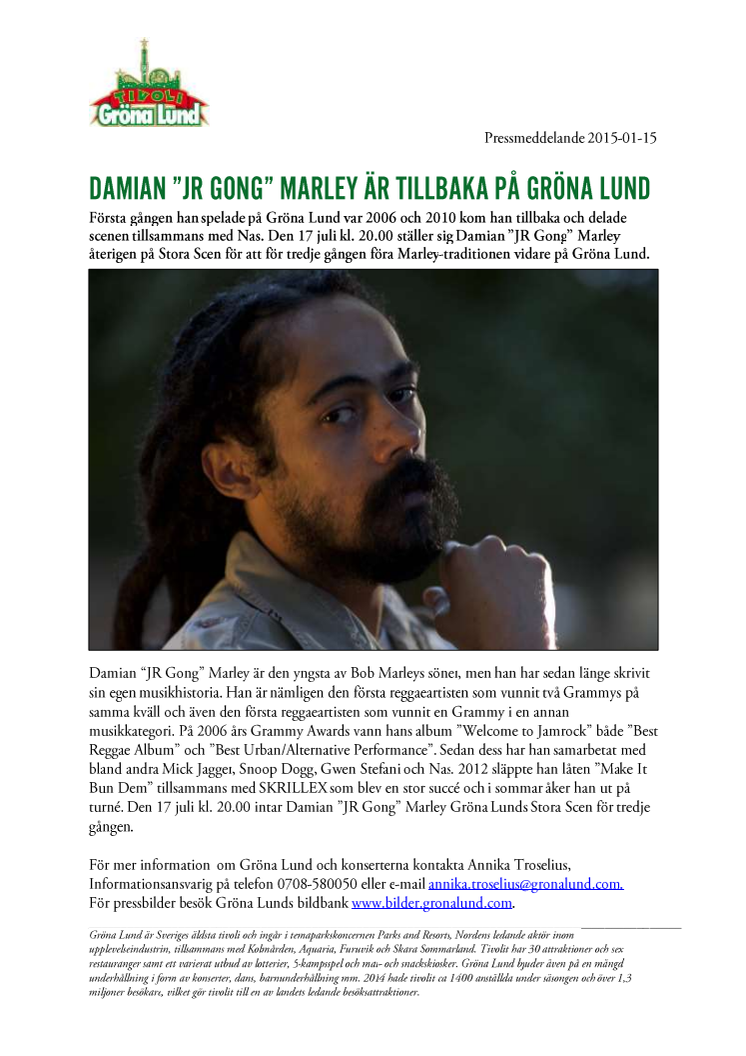 Första gången han spelade på Gröna Lund var 2006 och 2010 kom han tillbaka och delade scenen tillsammans med Nas. Den 17 juli kl. 20.00 ställer sig Damian ”JR Gong” Marley återigen på Stora Scen för att för tredje gången föra Marley-traditionen vidare på Gröna Lund.