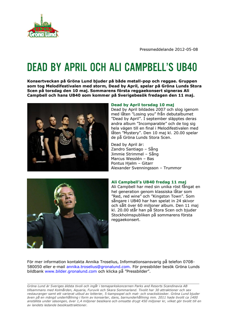 Konsertveckan på Gröna Lund bjuder på både metall-pop och reggae. Gruppen som tog Melodifestivalen med storm, Dead by April, spelar på Gröna Lunds Stora Scen på torsdag den 10 maj. Sommarens första reggaekonsert signeras Ali Campbell och hans UB40 som kommer på Sverigebesök fredagen den 11 maj.