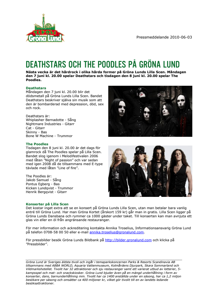 Nästa vecka är det hårdrock i olika hårda former på Gröna Lunds Lilla Scen. Måndagen den 7 juni kl. 20.00 spelar Deathstars och tisdagen den 8 juni kl. 20.00 spelar The Poodles.
