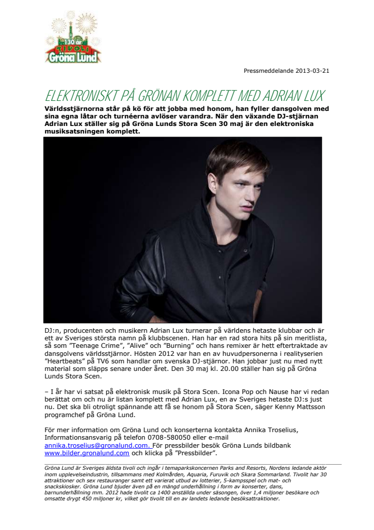 – I år har vi satsat på elektronisk musik på Stora Scen. Icona Pop och Nause har vi redan berättat om och nu är listan komplett med Adrian Lux, en av Sveriges hetaste DJ:s just nu. Det ska bli otroligt spännande att få se honom på Stora Scen, säger Kenny Mattsson programchef på Gröna Lund.