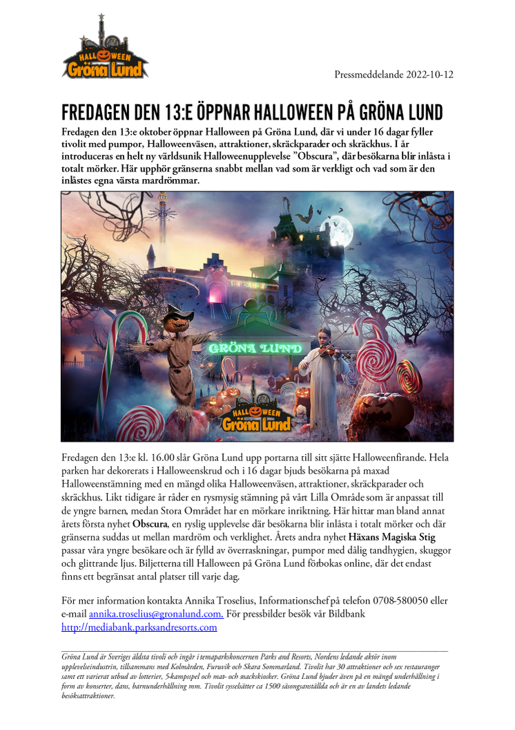 Fredagen den 13:e kl. 16.00 slår Gröna Lund upp portarna till sitt sjätte Halloweenfirande. Hela parken har dekorerats i Halloweenskrud och i 16 dagar bjuds besökarna på maxad Halloweenstämning med en mängd olika Halloweenväsen, attraktioner, skräckparader och skräckhus. Likt tidigare år råder en rysmysig stämning på vårt Lilla Område som är anpassat till de yngre barnen, medan Stora Området har en mörkare inriktning. Här hittar man bland annat årets första nyhet Obscura, en ryslig upplevelse där besökarna blir inlåsta i totalt mörker och där gränserna suddas ut mellan mardröm och verklighet. Årets andra nyhet Häxans Magiska Stig passar våra yngre besökare och är fylld av överraskningar, pumpor med dålig tandhygien, skuggor och glittrande ljus. Biljetterna till Halloween på Gröna Lund förbokas online, där det endast finns ett begränsat antal platser till varje dag.
