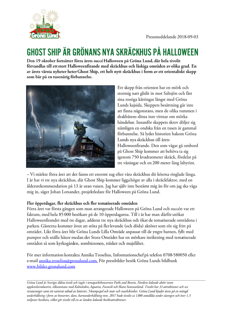 Den 19 oktober fortsätter förra årets succé Halloween på Gröna Lund, där hela tivolit förvandlas till ett stort Halloweenfirande med skräckhus och läskiga områden av olika grad. En av årets värsta nyheter heter Ghost Ship, ett helt nytt skräckhus i form av ett orientaliskt skepp som bär på en tusenårig förbannelse.