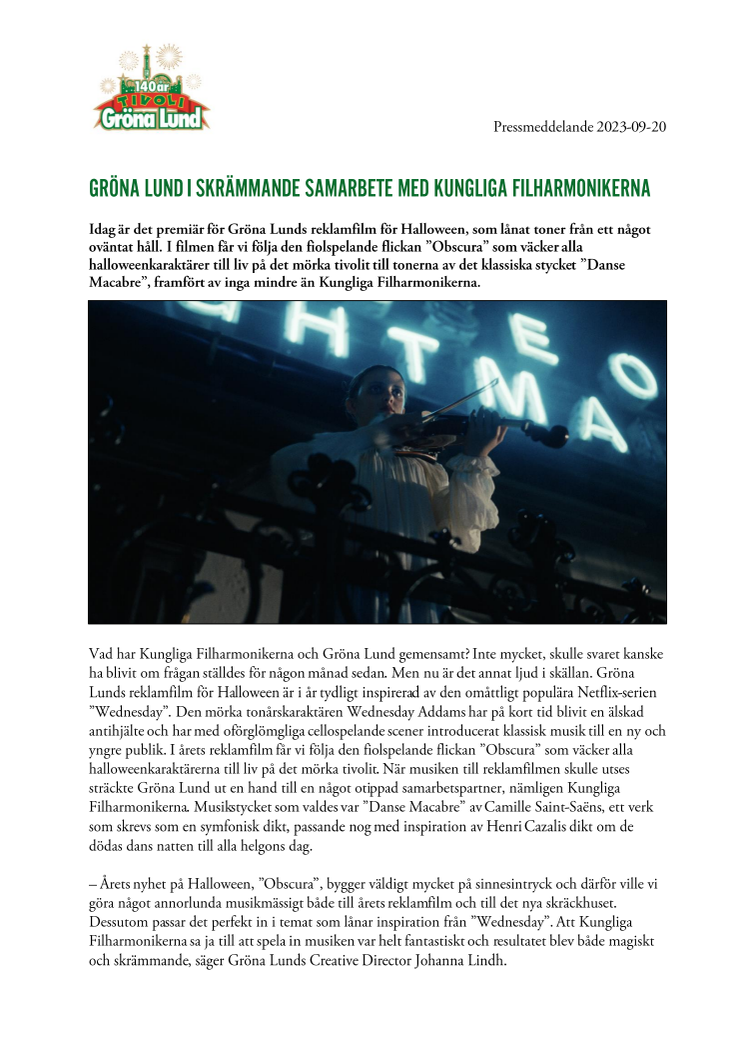 – Årets nyhet på Halloween, ”Obscura”, bygger väldigt mycket på sinnesintryck och därför ville vi göra något annorlunda musikmässigt både till årets reklamfilm och till det nya skräckhuset. Dessutom passar det perfekt in i temat som lånar inspiration från ”Wednesday”. Att Kungliga Filharmonikerna sa ja till att spela in musiken var helt fantastiskt och resultatet blev både magiskt och skrämmande, säger Gröna Lunds Creative Director Johanna Lindh.