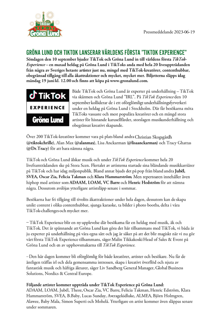 Söndagen den 10 september bjuder TikTok och Gröna Lund in till världens första TikTok-Experience – en maxad heldag på Gröna Lund i TikToks anda med hela 20 liveuppträdanden från några av Sveriges hetaste artister just nu, mingel med TikTok-kreatörer, contenthubbar, obegränsad tillgång till alla åkattraktioner och mycket, mycket mer. Biljetterna släpps idag måndag 19 juni kl. 12.00 och finns att köpa på www.gronalund.com.