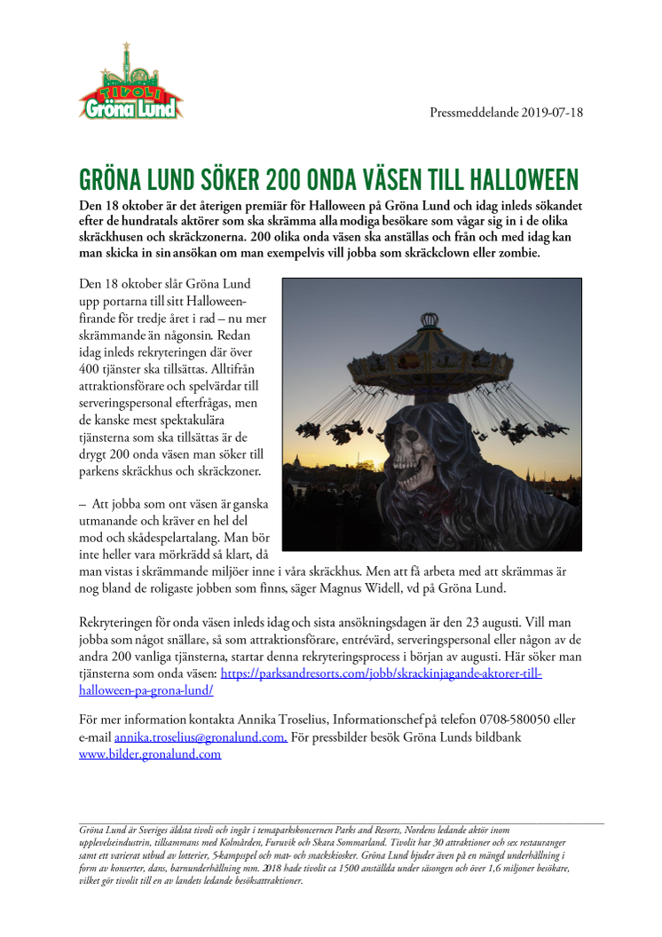 Rekryteringen för onda väsen inleds idag och sista ansökningsdagen är den 23 augusti. Vill man jobba som något snällare, så som attraktionsförare, entrévärd, serveringspersonal eller någon av de andra 200 vanliga tjänsterna, startar denna rekryteringsprocess i början av augusti. Här söker man tjänsterna som onda väsen: https://parksandresorts.com/jobb/skrackinjagande-aktorer-till-halloween-pa-grona-lund/