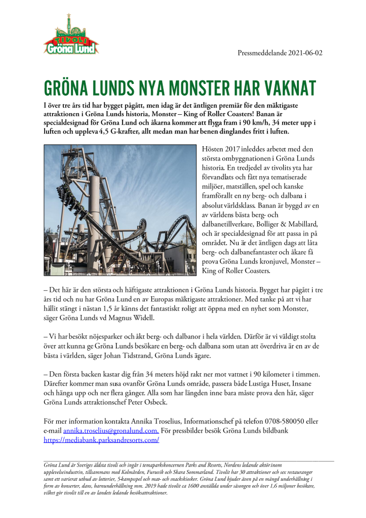 – Det här är den största och häftigaste attraktionen i Gröna Lunds historia. Bygget har pågått i tre års tid och nu har Gröna Lund en av Europas mäktigaste attraktioner. Med tanke på att vi har hållit stängt i nästan 1,5 år känns det fantastiskt roligt att öppna med en nyhet som Monster, säger Gröna Lunds vd Magnus Widell.