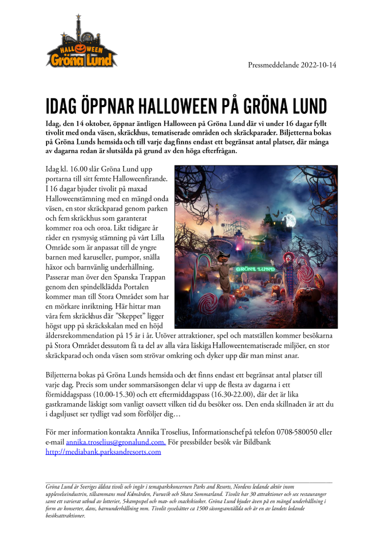 Idag kl. 16.00 slår Gröna Lund upp portarna till sitt femte Halloweenfirande. I 16 dagar bjuder tivolit på maxad Halloweenstämning med en mängd onda väsen, en stor skräckparad genom parken och fem skräckhus som garanterat kommer roa och oroa. Likt tidigare år råder en rysmysig stämning på vårt Lilla Område som är anpassat till de yngre barnen med karuseller, pumpor, snälla häxor och barnvänlig underhållning. Passerar man över den Spanska Trappan genom den spindelklädda Portalen kommer man till Stora Området som har en mörkare inriktning. Här hittar man våra fem skräckhus där ”Skeppet” ligger högst upp på skräckskalan med en höjd åldersrekommendation på 15 år i år. Utöver attraktioner, spel och matställen kommer besökarna på Stora Området dessutom få ta del av alla våra läskiga Halloweentematiserade miljöer, en stor skräckparad och onda väsen som strövar omkring och dyker upp där man minst anar.