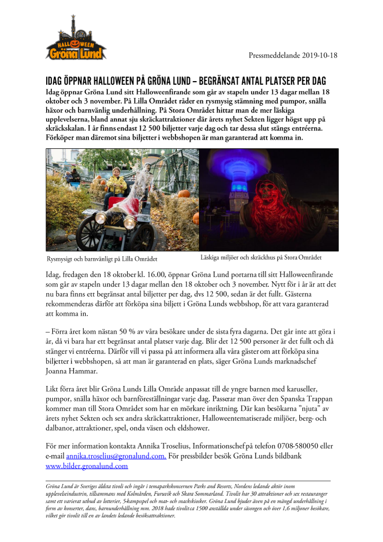 Idag, fredagen den 18 oktober kl. 16.00, öppnar Gröna Lund portarna till sitt Halloweenfirande som går av stapeln under 13 dagar mellan den 18 oktober och 3 november. Nytt för i år är att det nu bara finns ett begränsat antal biljetter per dag, dvs 12 500, sedan är det fullt. Gästerna rekommenderas därför att förköpa sina biljett i Gröna Lunds webbshop, för att vara garanterad att komma in.