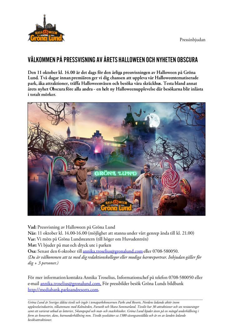 Den 11 oktober kl. 14.00 är det dags för den årliga pressvisningen av Halloween på Gröna Lund. Två dagar innan premiären ger vi dig chansen att uppleva vår Halloweentematiserade park, åka attraktioner, träffa Halloweenväsen och besöka våra skräckhus. Testa bland annat årets nyhet Obscura före alla andra - en helt ny Halloweenupplevelse där besökarna blir inlåsta i totalt mörker.