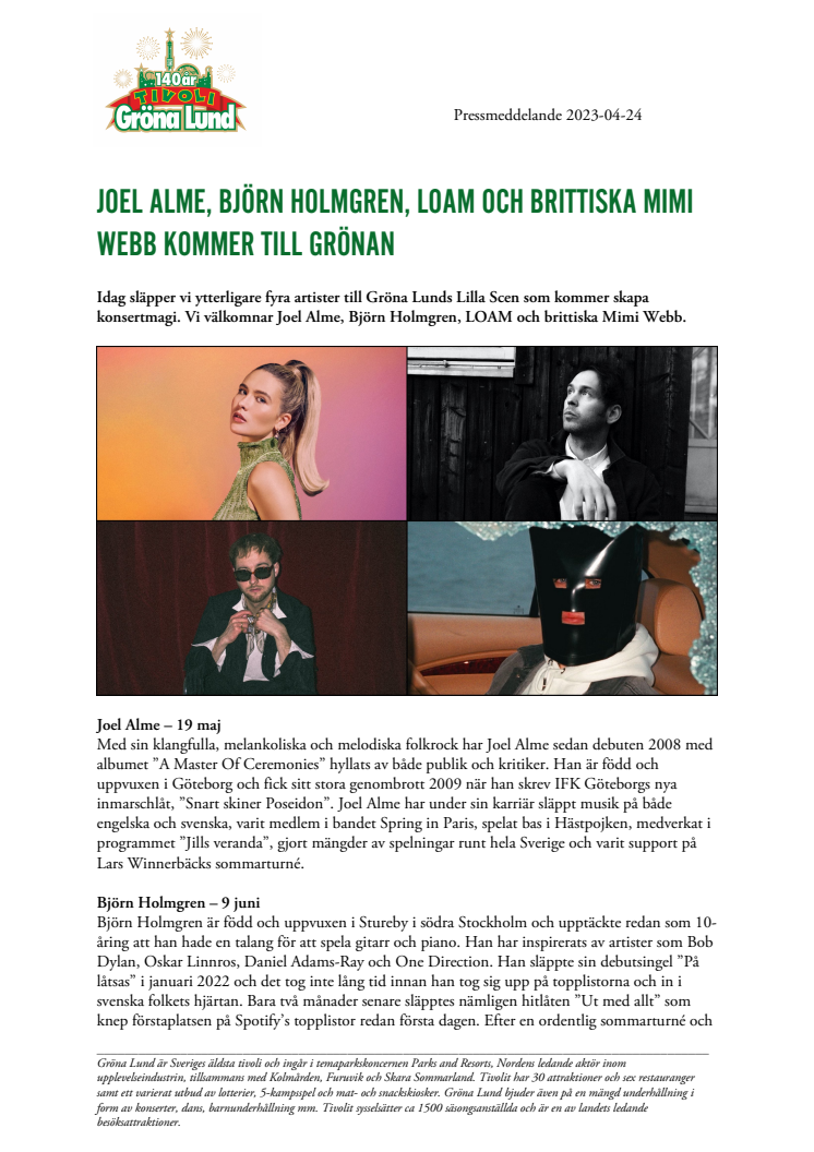 Idag släpper vi ytterligare fyra artister till Gröna Lunds Lilla Scen som kommer skapa konsertmagi. Vi välkomnar Joel Alme, Björn Holmgren, LOAM och brittiska Mimi Webb.