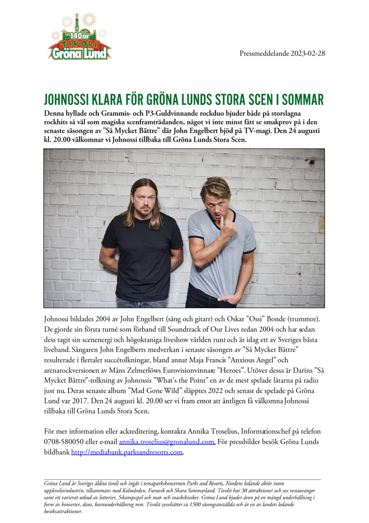 Johnossi bildades 2004 av John Engelbert (sång och gitarr) och Oskar ”Ossi” Bonde (trummor). De gjorde sin första turné som förband till Soundtrack of Our Lives redan 2004 och har sedan dess tagit sin scenenergi och högoktaniga liveshow världen runt och är idag ett av Sveriges bästa liveband. Sångaren John Engelberts medverkan i senaste säsongen av ”Så Mycket Bättre” resulterade i flertalet succétolkningar, bland annat Maja Francis ”Anxious Angel” och arenarockversionen av Måns Zelmerlöws Eurovisionvinnare ”Heroes”. Utöver dessa är Darins ”Så Mycket Bättre”-tolkning av Johnossis ”What’s the Point” en av de mest spelade låtarna på radio just nu. Deras senaste album ”Mad Gone Wild” släpptes 2022 och senast de spelade på Gröna Lund var 2017. Den 24 augusti kl. 20.00 ser vi fram emot att äntligen få välkomna Johnossi tillbaka till Gröna Lunds Stora Scen.