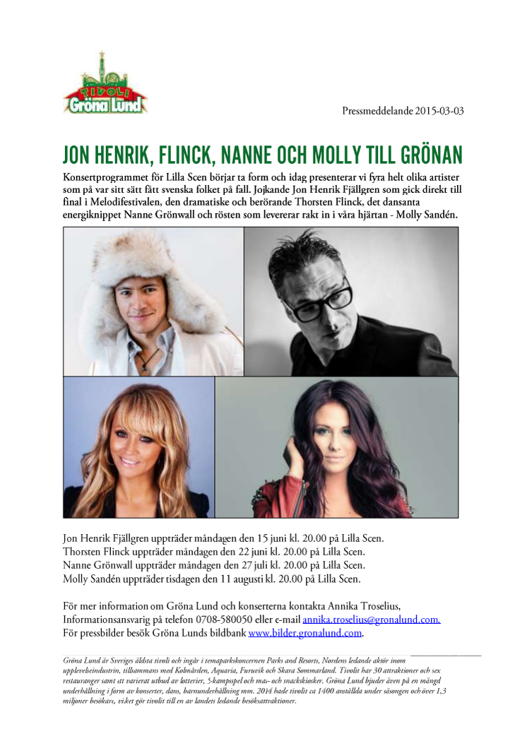 För mer information om Gröna Lund och konserterna kontakta Annika Troselius, Informationsansvarig på telefon 0708-580050 eller e-mail annika.troselius@gronalund.com. För pressbilder besök Gröna Lunds bildbank www.bilder.gronalund.com.