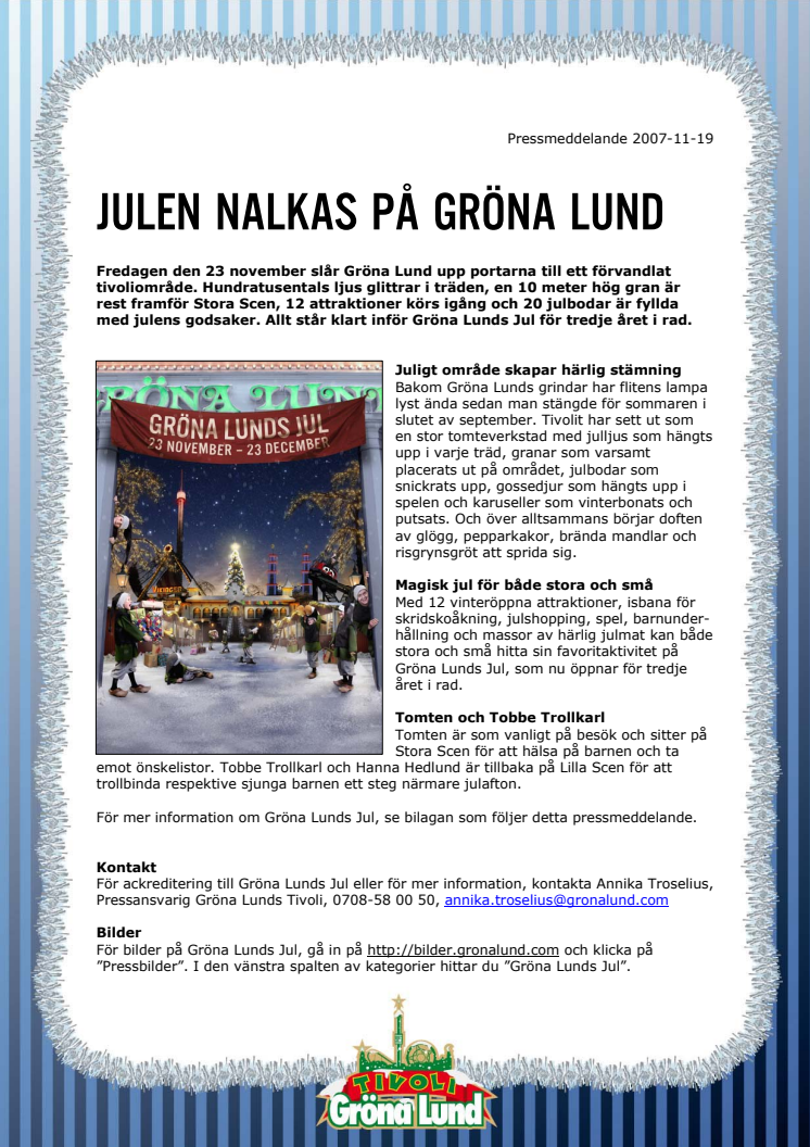 För ackreditering till Gröna Lunds Jul eller för mer information, kontakta Annika Troselius, Pressansvarig Gröna Lunds Tivoli, 0708-58 00 50, annika.troselius@gronalund.com