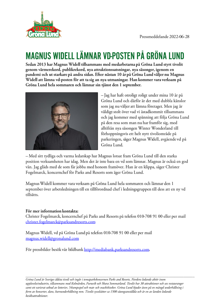 Magnus Widell, vd på Gröna Lund på telefon 010-708 91 00 eller per mail magnus.widell@gronalund.com