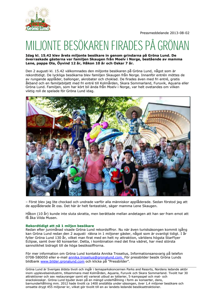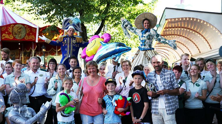 Idag kl. 15.42 klev årets miljonte besökare in genom grindarna på Gröna Lund. De överraskade gästerna var familjen Skaugen från Moelv i Norge, bestående av mamma Lene, pappa Ola, Öyvind 12 år, Håkon 10 år och Oskar 7 år.