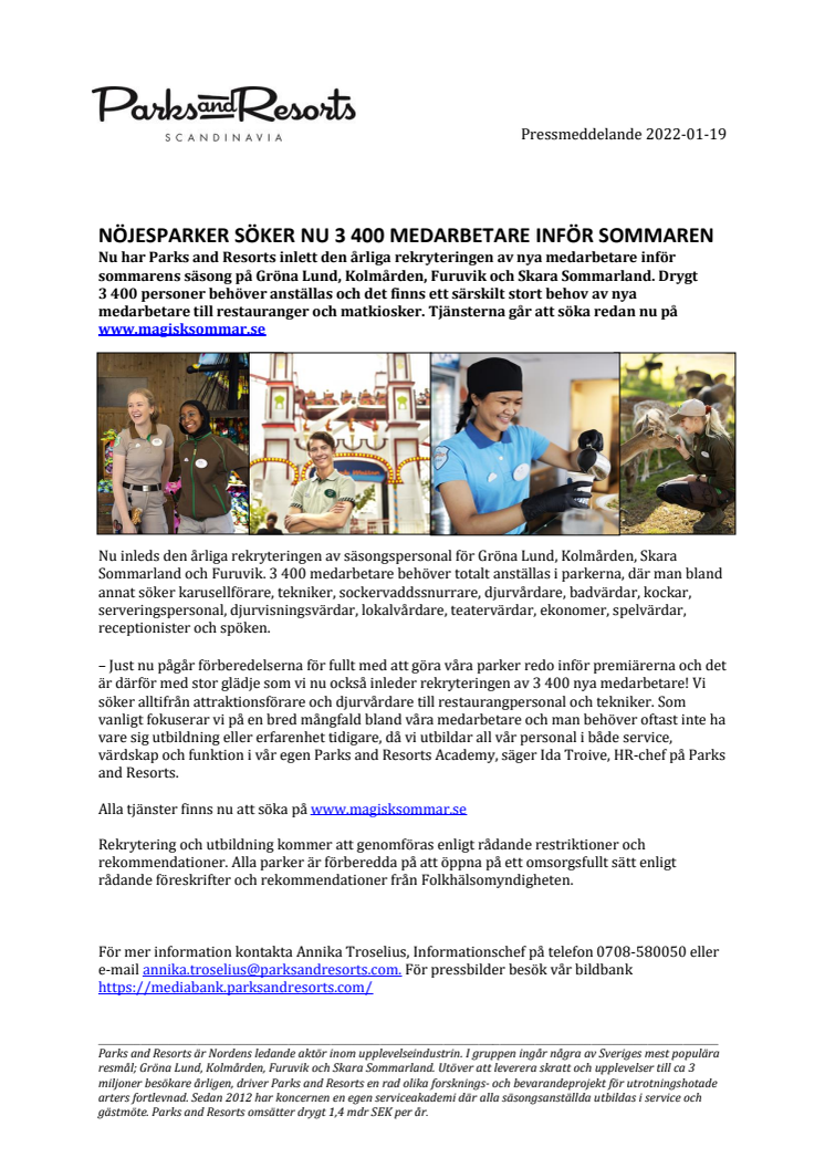– Just nu pågår förberedelserna för fullt med att göra våra parker redo inför premiärerna och det är därför med stor glädje som vi nu också inleder rekryteringen av 3 400 nya medarbetare! Vi söker alltifrån attraktionsförare och djurvårdare till restaurangpersonal och tekniker. Som vanligt fokuserar vi på en bred mångfald bland våra medarbetare och man behöver oftast inte ha vare sig utbildning eller erfarenhet tidigare, då vi utbildar all vår personal i både service, värdskap och funktion i vår egen Parks and Resorts Academy, säger Ida Troive, HR-chef på Parks and Resorts.