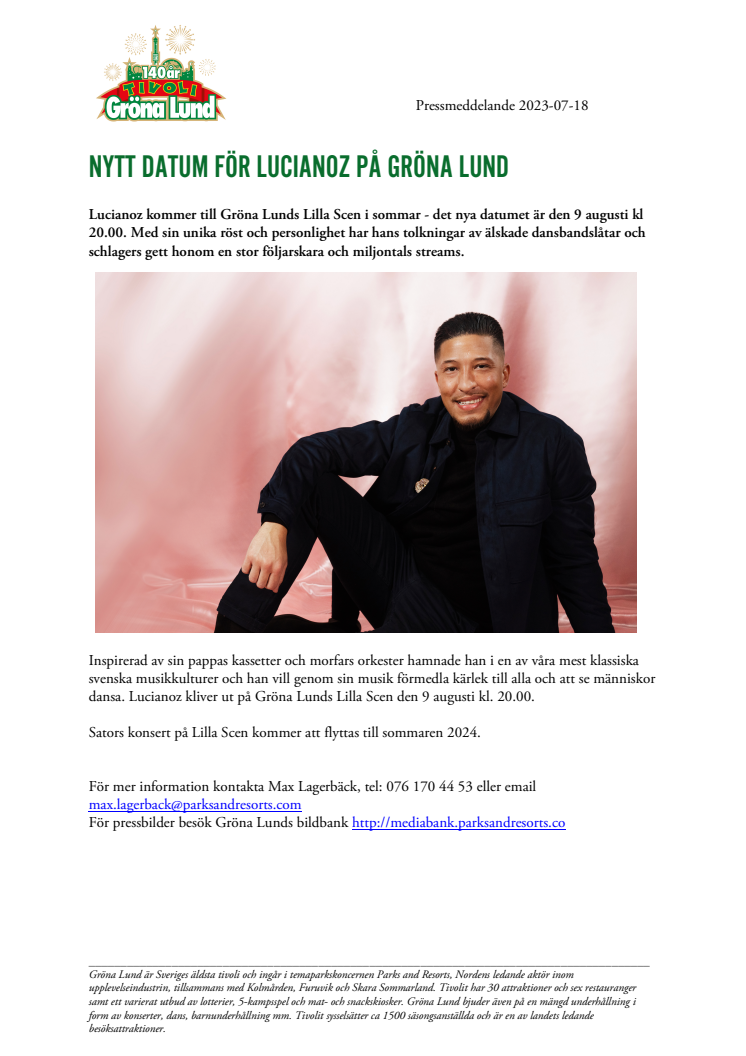 Lucianoz kommer till Gröna Lunds Lilla Scen i sommar - det nya datumet är den 9 augusti kl 20.00. Med sin unika röst och personlighet har hans tolkningar av älskade dansbandslåtar och schlagers gett honom en stor följarskara och miljontals streams.