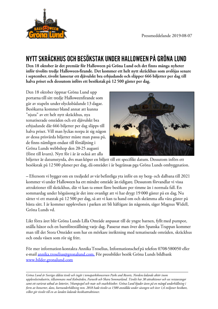 – Eftersom vi bygger om en tredjedel av vår befintliga yta inför en ny berg- och dalbana till 2021 kommer vi under Halloween ha ett mindre område än tidigare. Dessutom förvandlar vi vissa attraktioner till skräckhus, där vi kan ta emot färre besökare per timme än i normala fall. En sommardag under högsäsong är det inte ovanligt att vi har drygt 19 000 gäster på en dag. Nu sätter vi ett maxtak på 12 500 per dag, så att vi kan ta hand om och skrämma alla våra gäster på bästa sätt. I år kommer upplevelsen i parken att bli häftigare än någonsin, säger Magnus Widell, Gröna Lunds vd.