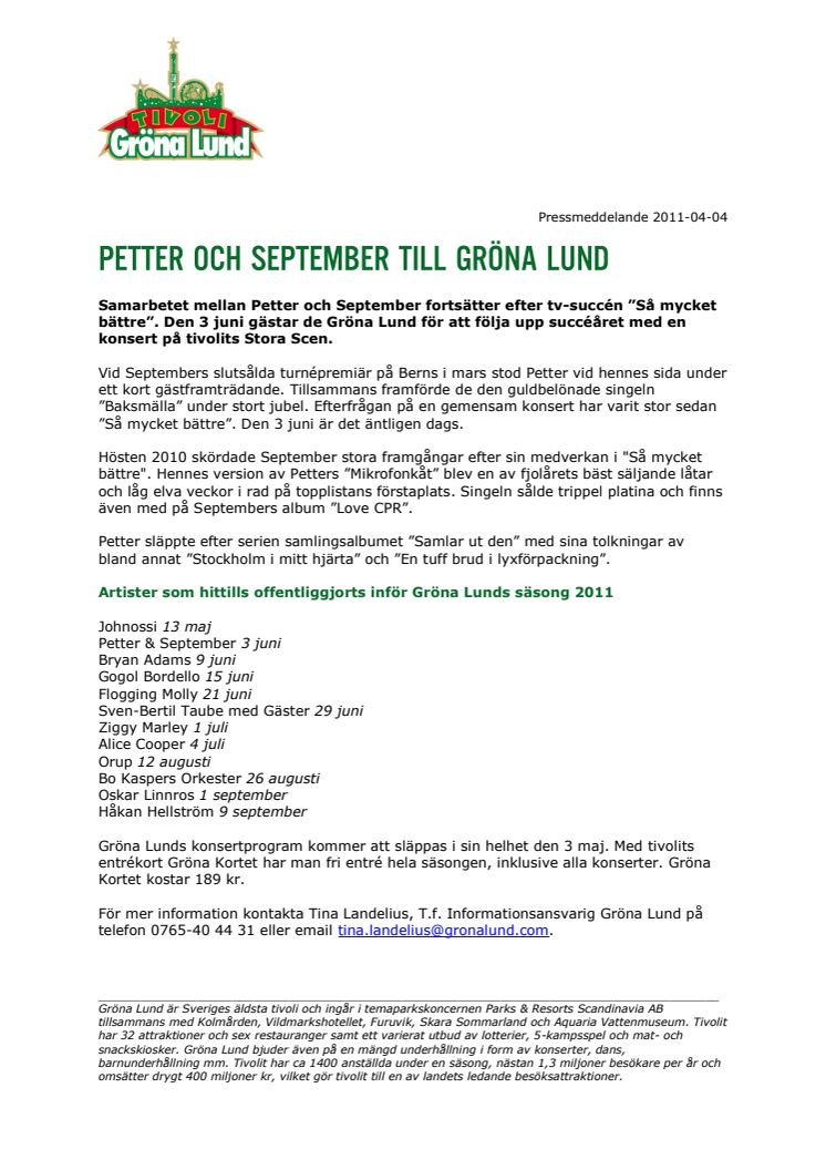Samarbetet mellan Petter och September fortsätter efter tv-succén ”Så mycket bättre”. Den 3 juni gästar de Gröna Lund för att följa upp succéåret med en konsert på tivolits Stora Scen.