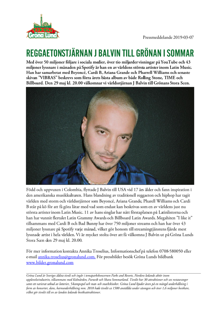 Med över 50 miljoner följare i sociala medier, över tio miljarder visningar på YouTube och 43 miljoner lyssnare i månaden på Spotify är han en av världens största artister inom Latin Music. Han har samarbetat med Beyoncé, Cardi B, Ariana Grande och Pharrell Williams och senaste skivan ”VIBRAS” beskrevs som förra årets bästa album av både Rolling Stone, TIME och Billboard. Den 29 maj kl. 20.00 välkomnar vi världsstjärnan J Balvin till Grönans Stora Scen.
