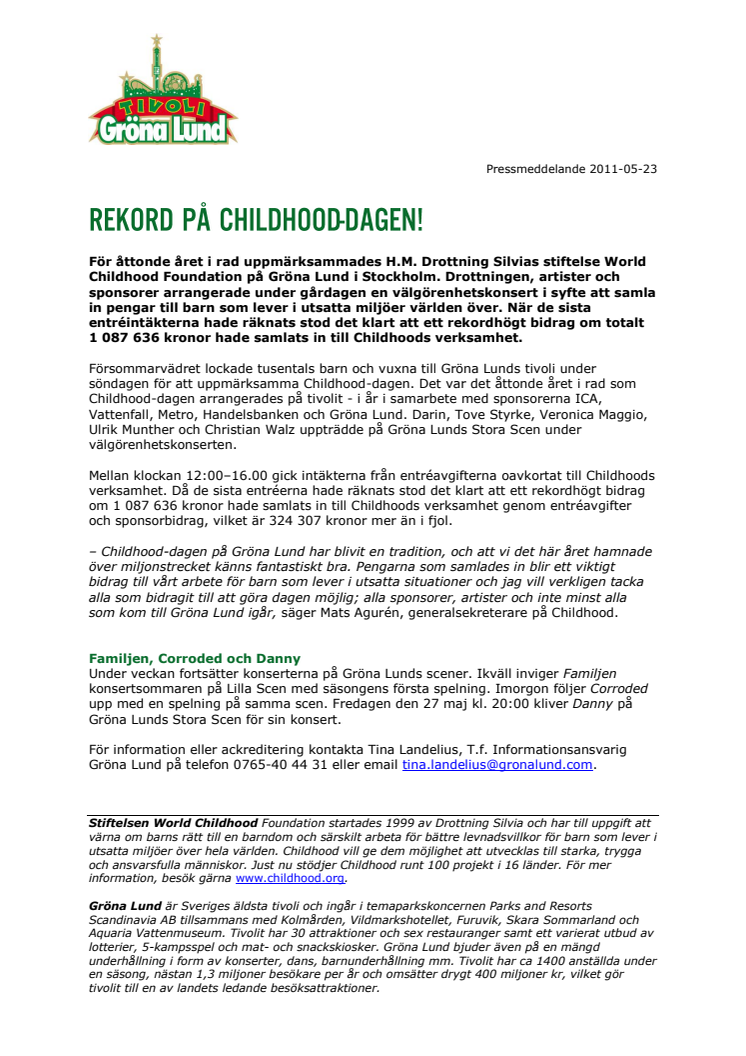För åttonde året i rad uppmärksammades H.M. Drottning Silvias stiftelse World Childhood Foundation på Gröna Lund i Stockholm. Drottningen, artister och sponsorer arrangerade under gårdagen en välgörenhetskonsert i syfte att samla in pengar till barn som lever i utsatta miljöer världen över. När de sista entréintäkterna hade räknats stod det klart att ett rekordhögt bidrag om totalt 1 087 636 kronor hade samlats in till Childhoods verksamhet.