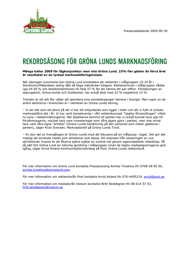- Vi ser det som ett bevis på att vi har ett erbjudande som ligger i tiden och att vi fullt ut lyckats marknadsföra det i år. Vi har varit konsekventa i vårt reklamkoncept "Upplev förvandlingen" vilket nu syns i reklammätningarna. När besökarna kommit till parken har vi också kunnat leva upp till förväntningarna, mycket tack vare investeringar som våra ägare gjort i parken, men inte minst tack vare våra egna "artister" (Gröna Lunds benämning på den personal som möter gästerna i parken), säger Kicki Svensén, Marknadschef på Gröna Lunds Tivoli.
