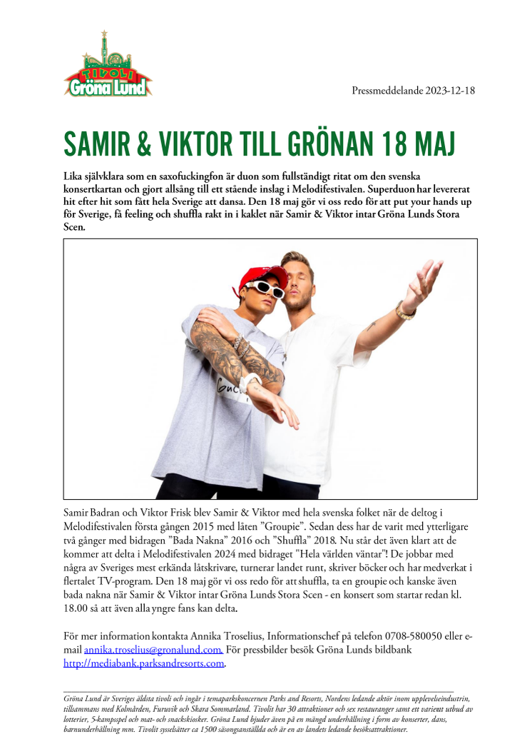 Samir Badran och Viktor Frisk blev Samir & Viktor med hela svenska folket när de deltog i Melodifestivalen första gången 2015 med låten ”Groupie”. Sedan dess har de varit med ytterligare två gånger med bidragen ”Bada Nakna” 2016 och ”Shuffla” 2018. Nu står det även klart att de kommer att delta i Melodifestivalen 2024 med bidraget "Hela världen väntar"! De jobbar med några av Sveriges mest erkända låtskrivare, turnerar landet runt, skriver böcker och har medverkat i flertalet TV-program. Den 18 maj gör vi oss redo för att shuffla, ta en groupie och kanske även bada nakna när Samir & Viktor intar Gröna Lunds Stora Scen - en konsert som startar redan kl. 18.00 så att även alla yngre fans kan delta.