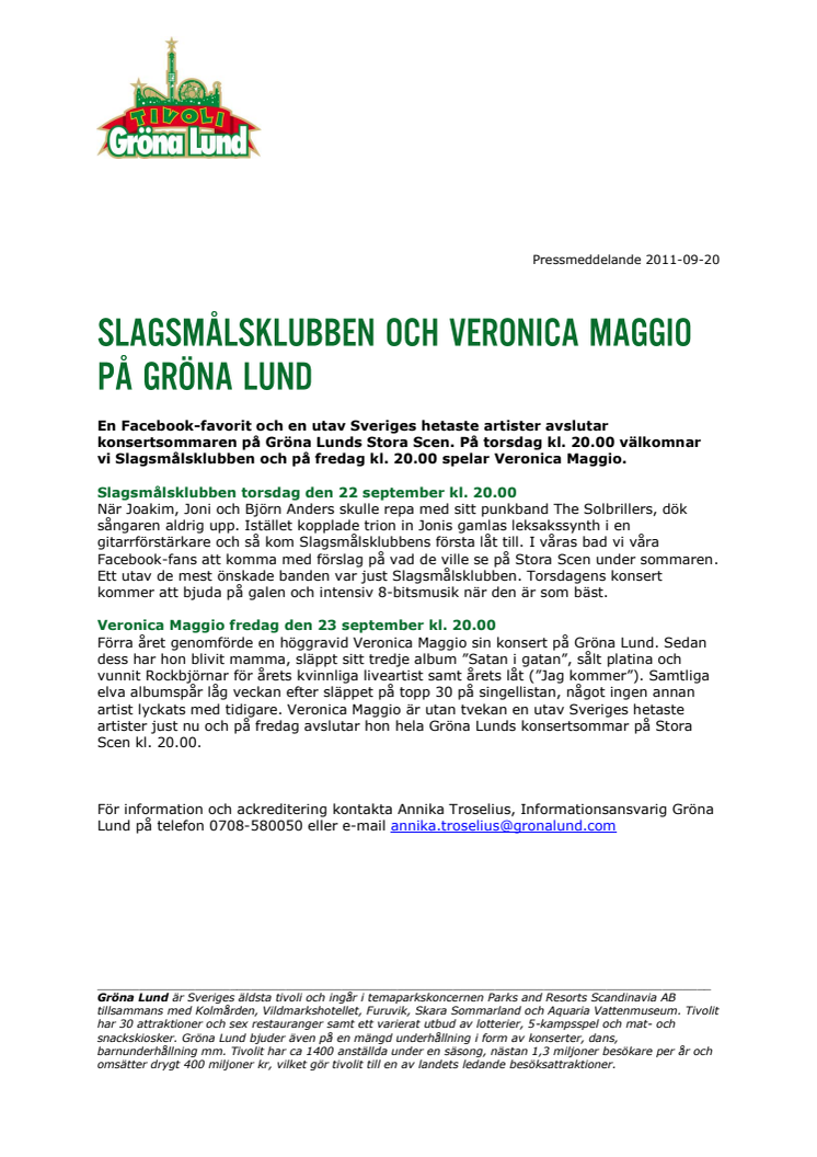 För information och ackreditering kontakta Annika Troselius, Informationsansvarig Gröna Lund på telefon 0708-580050 eller e-mail annika.troselius@gronalund.com