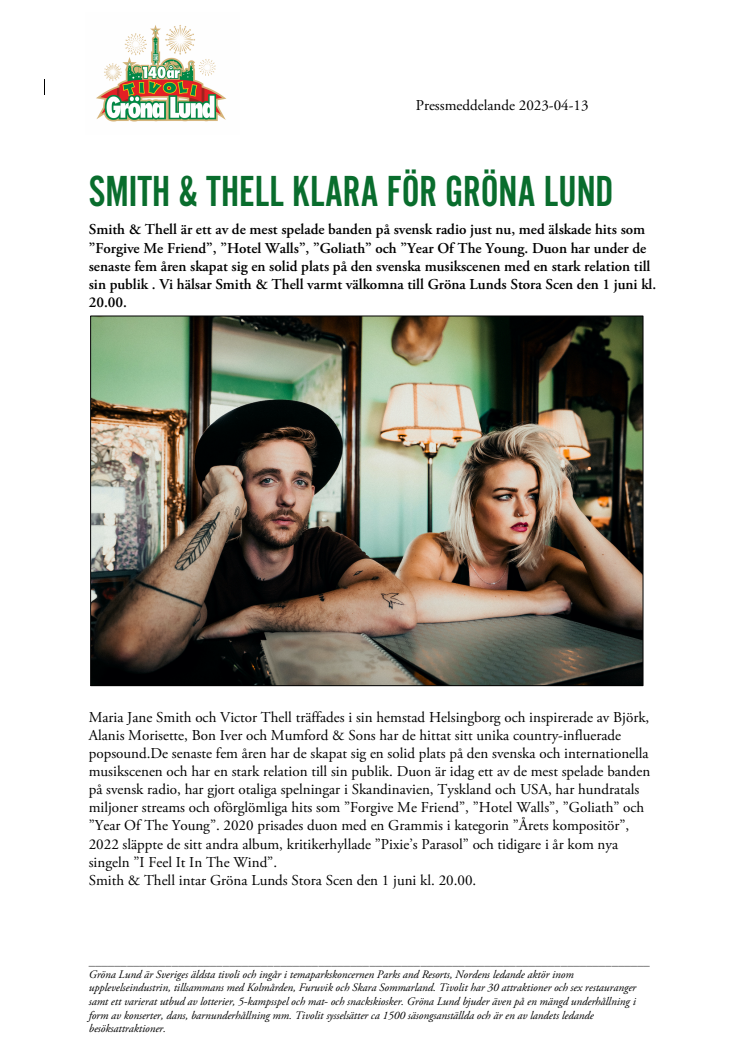 Smith & Thell är ett av de mest spelade banden på svensk radio just nu, med älskade hits som ”Forgive Me Friend”, ”Hotel Walls”, ”Goliath” och ”Year Of The Young. Duon har under de senaste fem åren skapat sig en solid plats på den svenska musikscenen med en stark relation till sin publik . Vi hälsar Smith & Thell varmt välkomna till Gröna Lunds Stora Scen den 1 juni kl. 20.00.