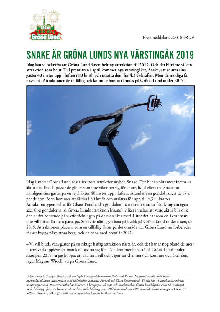 Idag lanserar Gröna Lund nästa års stora attraktionsnyhet, Snake. Det blir tivolits mest intensiva åktur hittills och passar de gäster som inte viker ner sig för snurr, höjd eller fart. Snake tar nämligen sina gäster på en rejäl åktur 40 meter upp i luften, sittandes i en gondol längst ut på en pendelarm. Man kommer att färdas i 80 km/h och utsättas för upp till 4,3 G-krafter. Attraktionstypen kallas för Chaos Pendle, där gondolen man sitter i snurrar fritt kring sin egen axel (likt gondolerna på Gröna Lunds attraktion Insane), vilket innebär att varje åktur blir olik den andra beroende på viktfördelningen på de man åker med. Låter det här som en åktur man inte vill missa får man passa på. Snake är nämligen bara på besök på Gröna Lund under säsongen 2019. Attraktionen placeras som en tillfällig åktur på det område där Gröna Lund nu förbereder för att bygga nästa stora berg- och dalbana med premiär 2021.