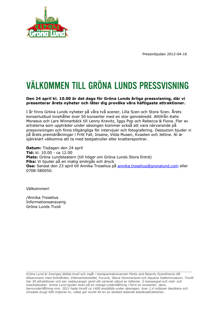 I år finns Gröna Lunds nyheter på våra två scener, Lilla Scen och Stora Scen. Årets konsertutbud innehåller över 50 konserter med en stor genrebredd. Alltifrån Kalle Moraeus och Lars Winnerbäck till Lenny Kravitz, Iggy Pop och Rebecca & Fiona. Fler av artisterna som uppträder under säsongen kommer också att vara närvarande på pressvisningen och finns tillgängliga för intervjuer och fotografering. Dessutom bjuder vi på årets premiäråkningar i Fritt Fall, Insane, Vilda Musen, Kvasten och Jetline. Ni är självklart välkomna att ta med testpatruller eller knattereportrar.