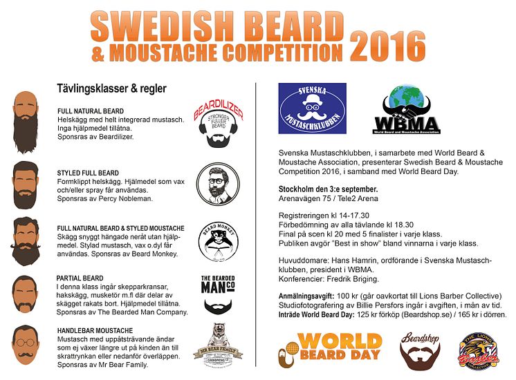 Hans Hamrin och Svenska Mustaschklubben har lång erfarenhet av skäggtävlingar, både i Sverige och utomlands. I VM tävlar man i minst 18 klasser, ett omfattande arrangemang. Till Swedish Beard & Moustache Competition 2016 har de valt ut 5 tävlingsklasser inom skägg och mustasch, med internationell bedömning: