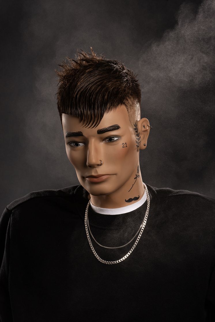 Klipphuvudena kommer från Pivot Point, barberare tävlar på "Zachary" och barberarstudenter på "Samuel". 100% naturligt hår från Kina/Indien som handsys på klippdockan. SA8000 certifiering, vilket innebär att alla delar inom tillverkningen har granskats och godkänts enligt standarden för "best practice" av Social Accountability International (SAI).