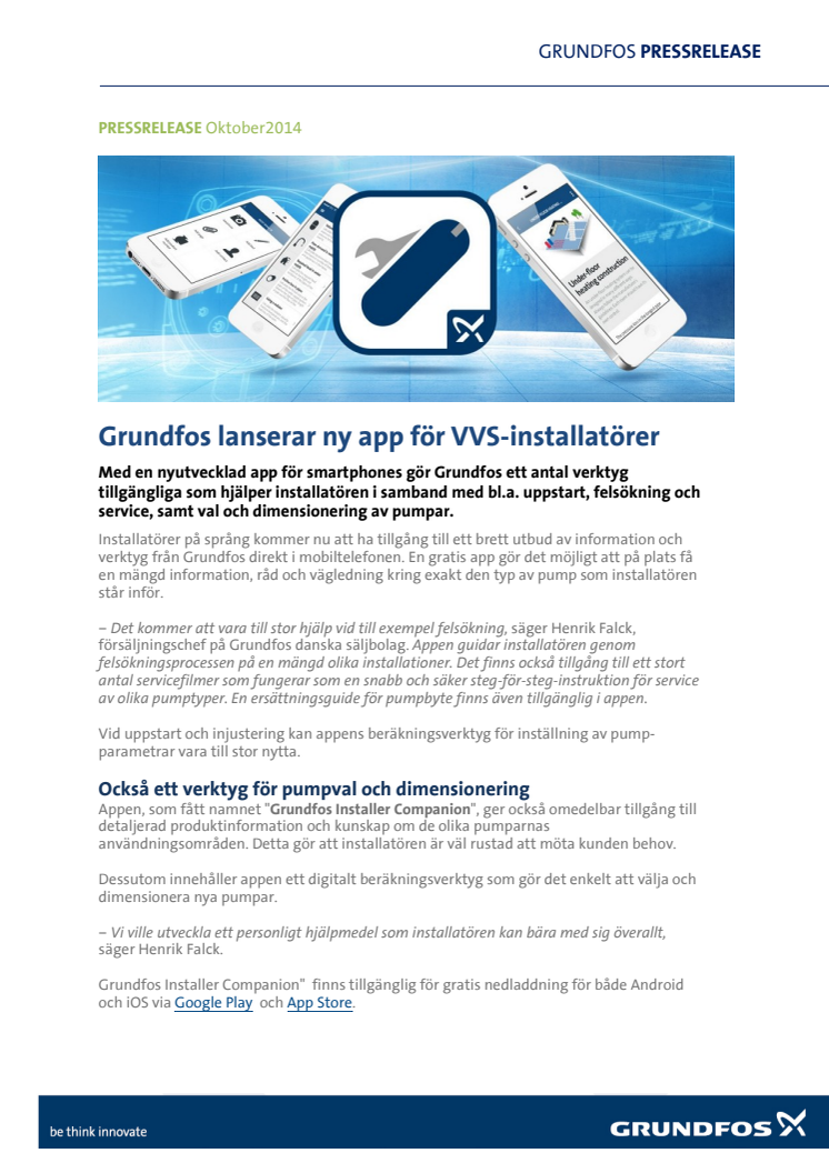 Med en nyutvecklad app för smartphones gör Grundfos ett antal verktyg tillgängliga som hjälper installatören i samband med bl.a. uppstart, felsökning och service, samt val och dimensionering av pumpar.