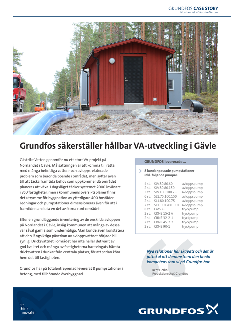 Grundfos har på totalentreprenad levererat 8 pumpstationer i betong, med tillhörande överbyggnad. Dessa huvudpumpstationer skall över ett stort område transportera det spillvatten som de enskilda avloppen levererar in. Förutom högt ställda krav på funktion fanns det här även speciella kultur- och miljökrav på de röda stugorna.